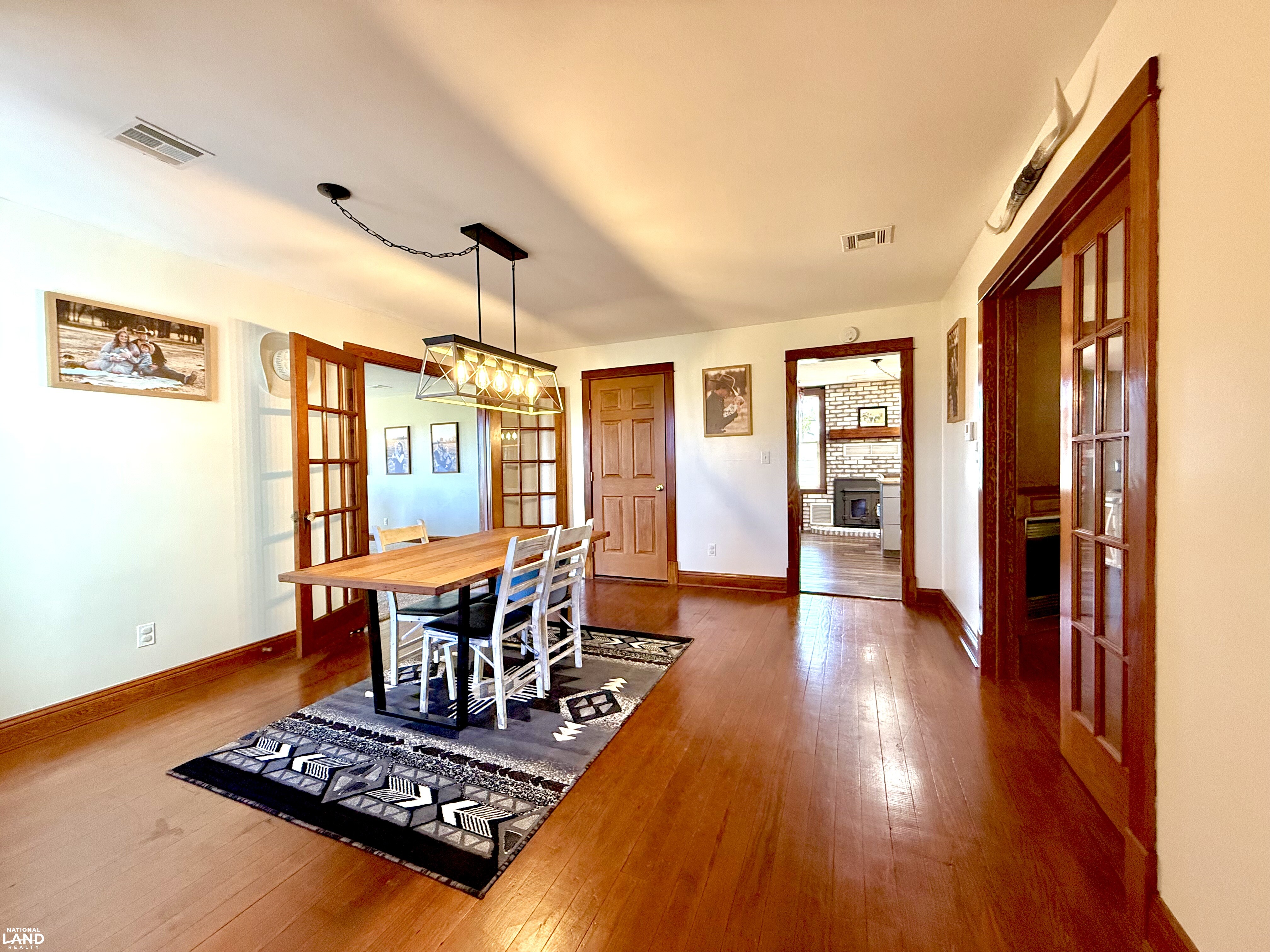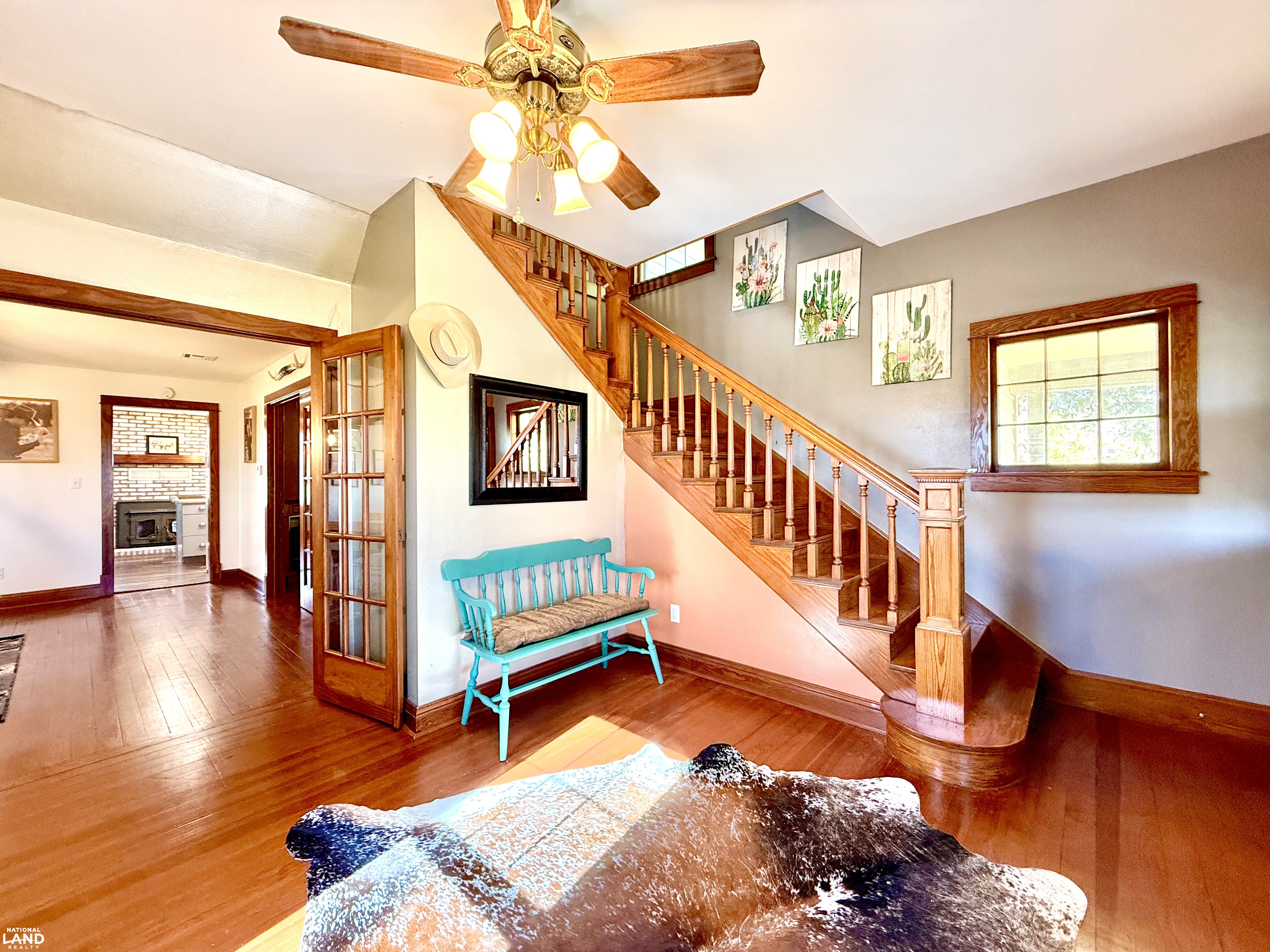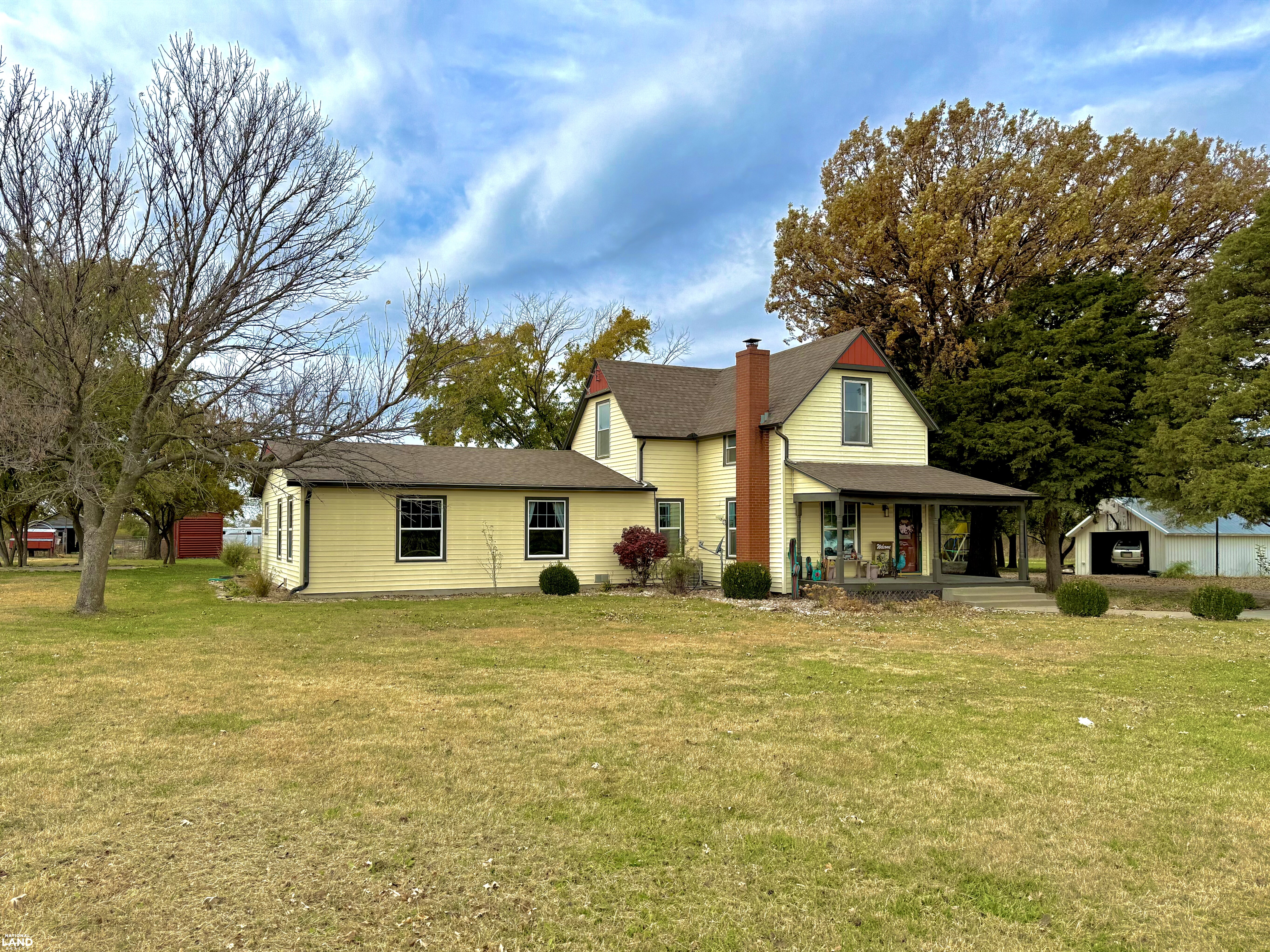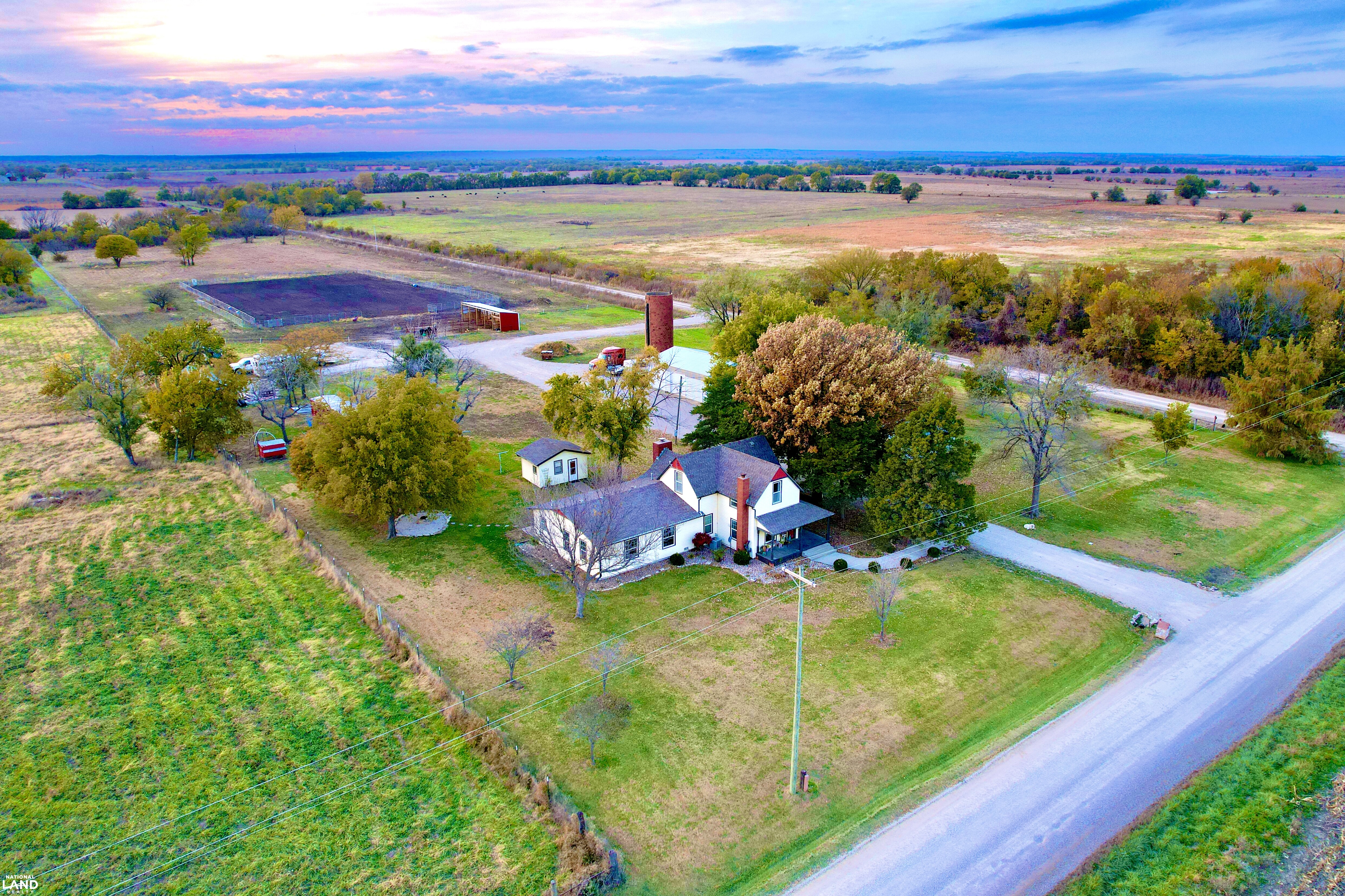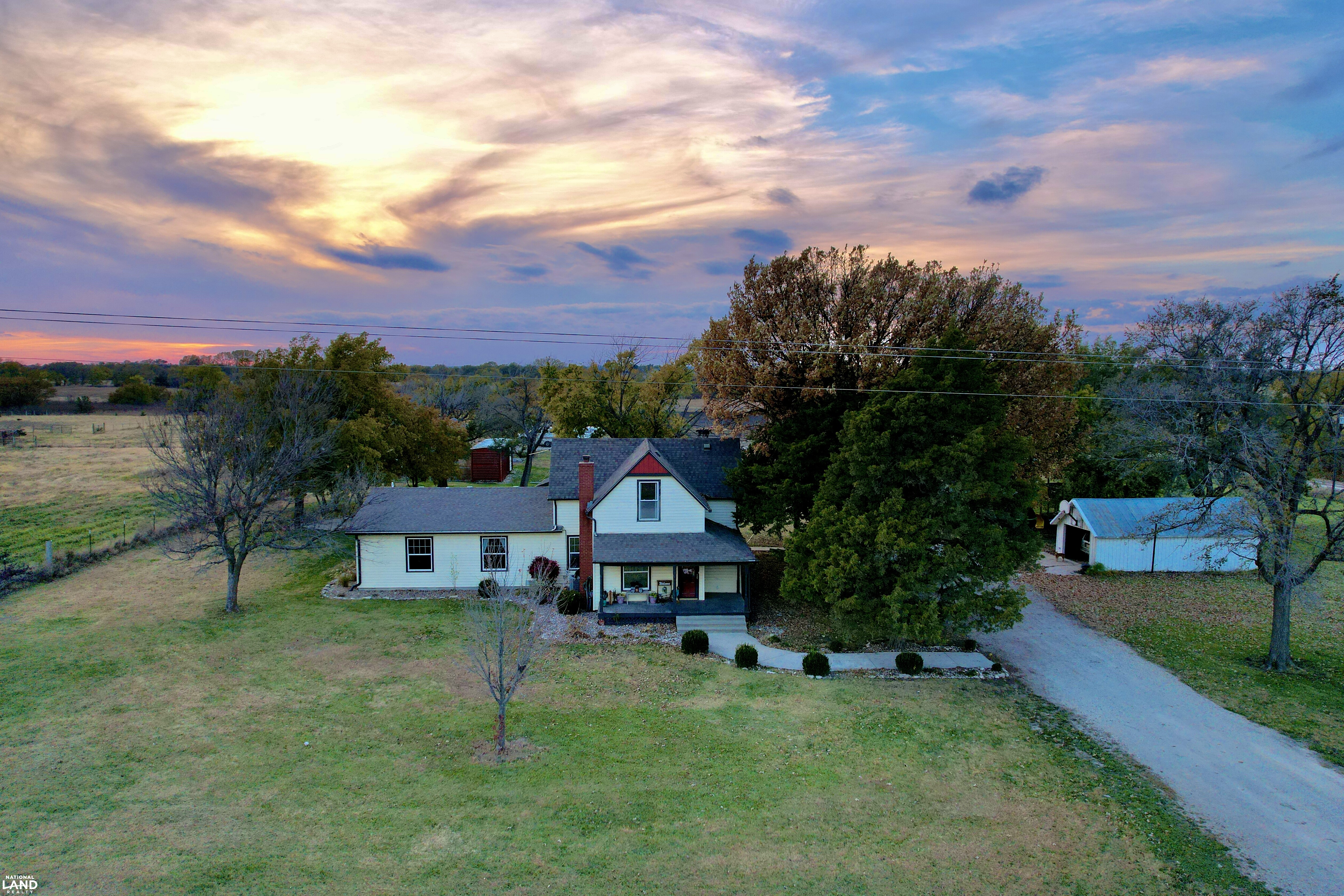 Beautifully renovated 4 bedroom, 2 bathroom farmhouse sitting on 9 +/- country acres. Offering 2400 sq ft of living space, this home combines modern comfort and timeless character. Features original hardwood floors, updated windows, updated infrastructure, a stunning staircase, formal dining room, and spacious living area. The kitchen offers a large island and wood burning fireplace which is ducted through portions of the house for cozy warmth. The primary bedroom and bath is on the main floor, with three additional bedrooms on the second floor. A large mudroom with laundry is conveniently located at the rear entrance. Outside you'll find a 30 x 40 shop, small office building (she shed or man cave), old boxcar that serves as a dog kennel and tack room, chicken coop, single car garage, and open horse stalls with 50' pipe runs. This property blends charm, functionality, and country living. *Note - coral panels not staying around arena or small animal shed. Funding approval required for showings.