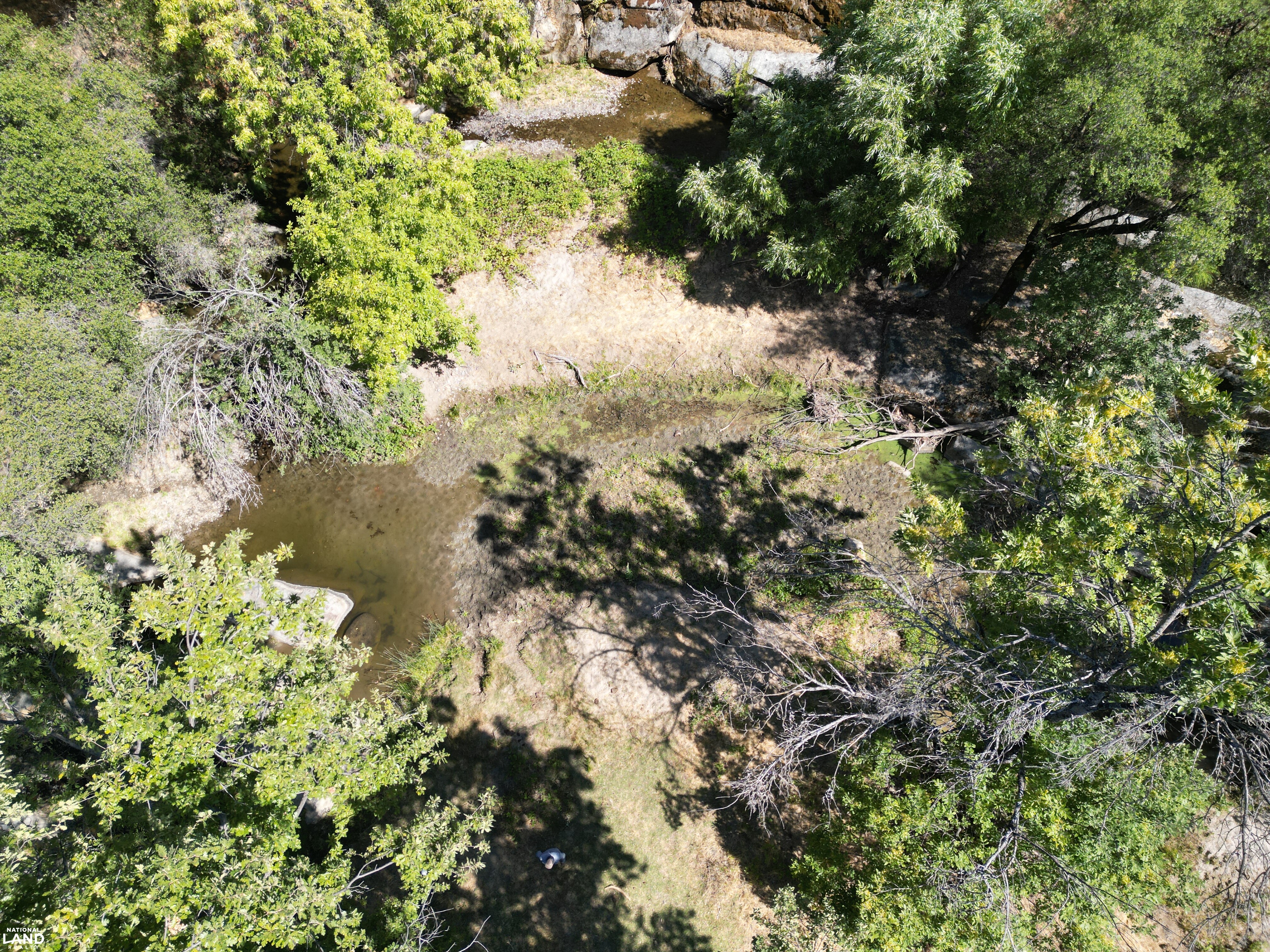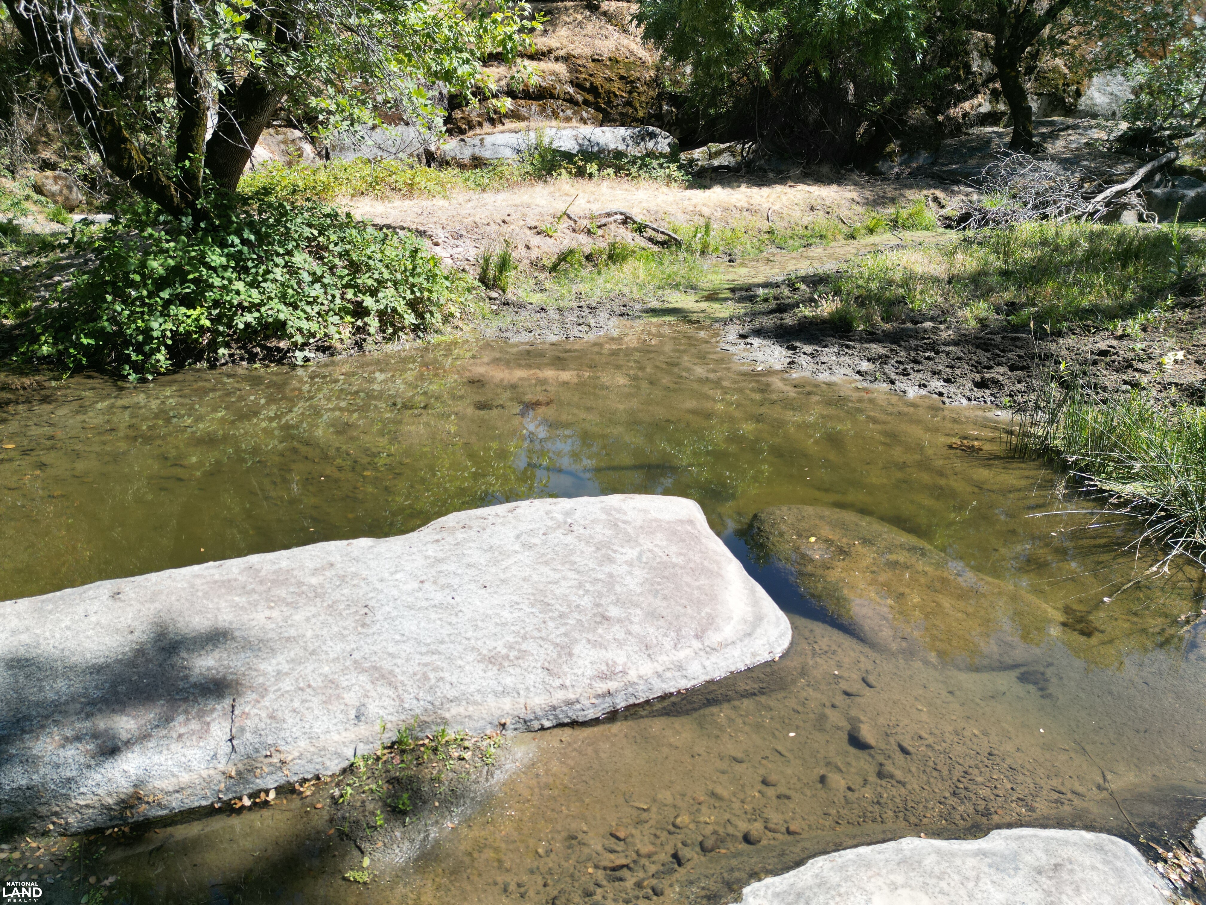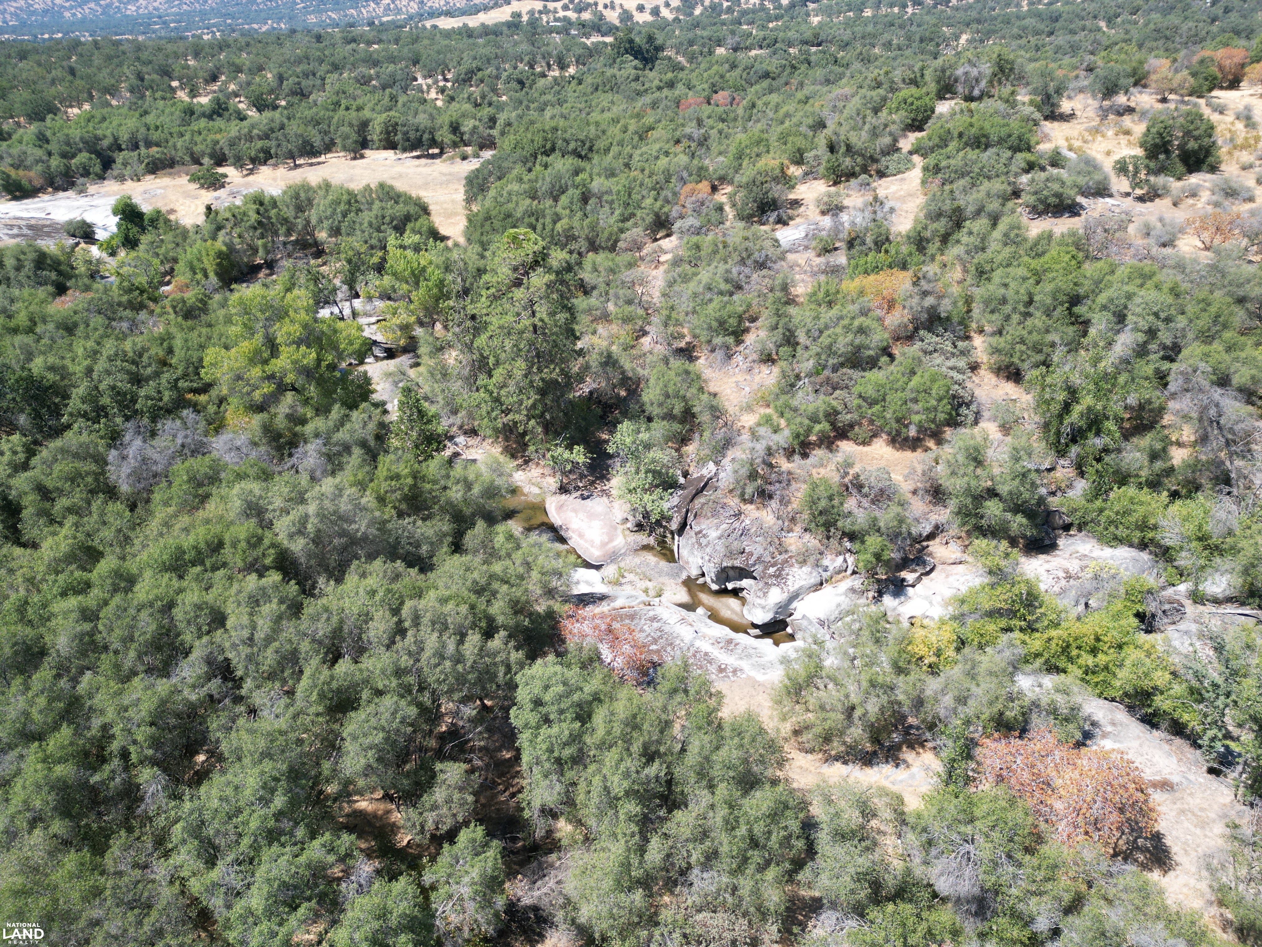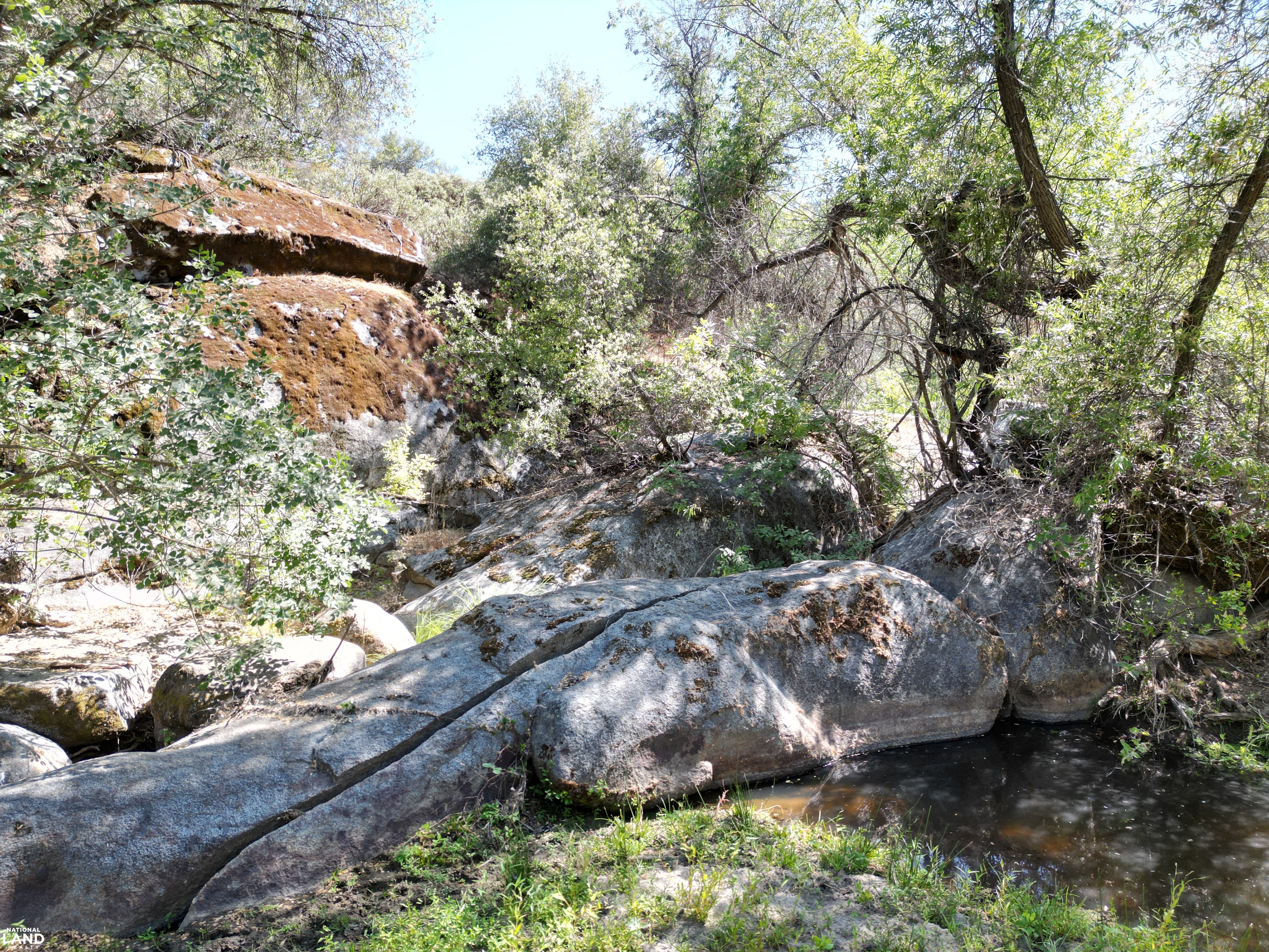 - Geological Features: Striking granite rock formations and year-round water pools throughout the property; seasonal waterfalls appear in winter months Water Features: Flowing creek offers consistent water movement across the acreage