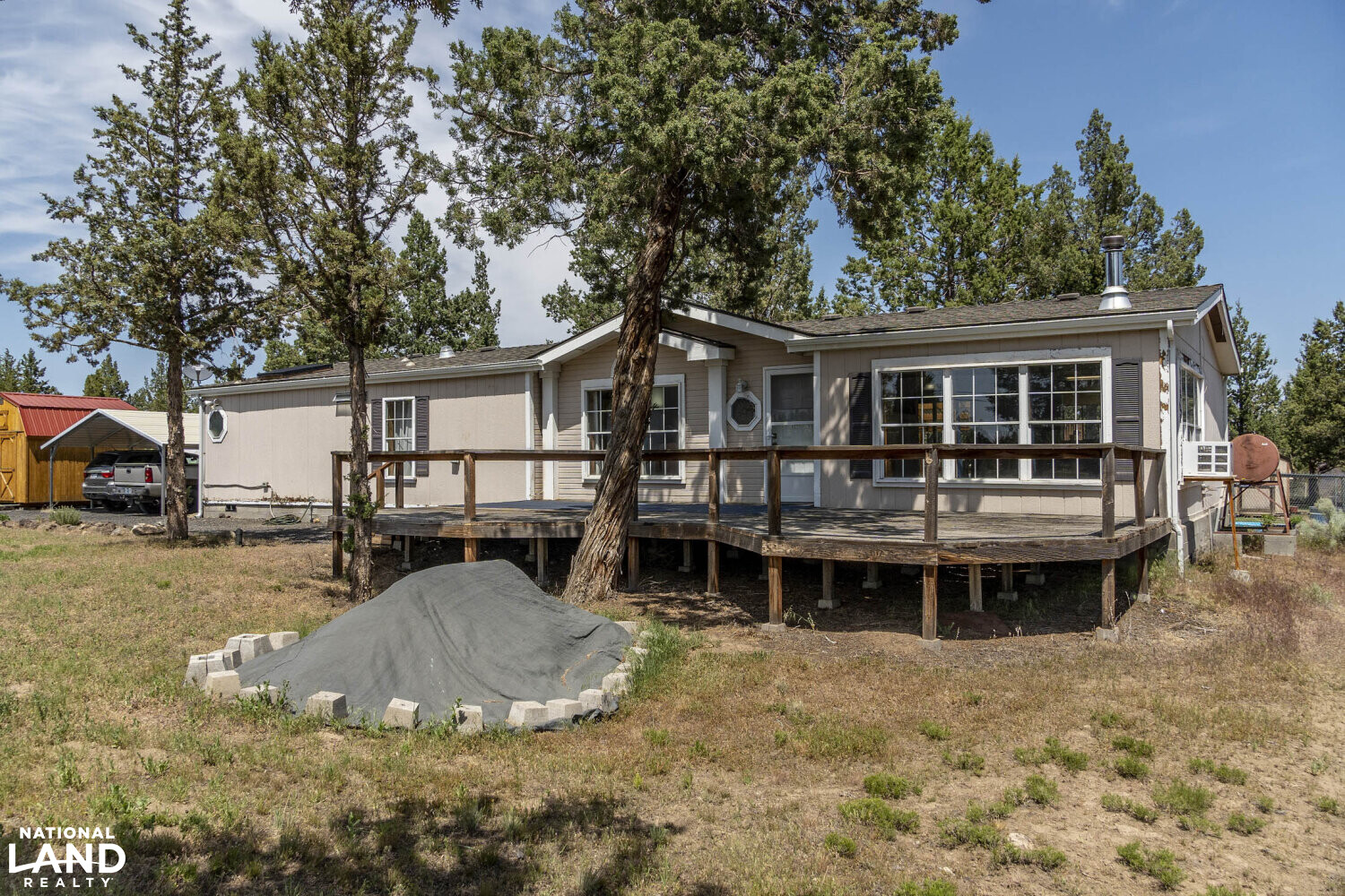 This 1.89 acre Terrebonne property has a 1782 sq ft 3 bed 2 bath manufactured home perfect for family living. The large 16x32 front deck is welcoming and would be a peaceful spot for relaxing and watching the sun go down behind the trees. The property is great for family and friends gathering times. The kitchen has a large island with plenty of room for multiple crowd pleasing dishes. The covered back deck is enclosed with railings, banisters, and gates on each end. Within the chain link fenced back yard are pavers that lead to different cozy spots for conversation or quiet times. The juniper trees offer shade as a gentle cooling breeze sweeps across the lush green grass. There is a wonderful kid friendly play structure that begs to be used by happy children. This property has a man's dream shop with a man door, two 12 ft overhead doors, shelving, reinforced concrete slab for two post lift, gravel and power. Three sheds with power to one and diesel plugin for cold weather.