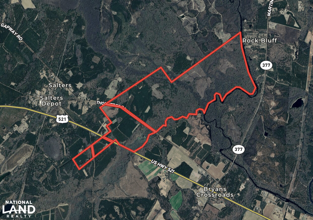 This property has entrances on HWY 521 and Thorntree Rd. The 521 entrance is 1.4 Miles west of Coopers Country Store. The Thorntree Rd entrance is 1.2 Miles west of highway 377.
